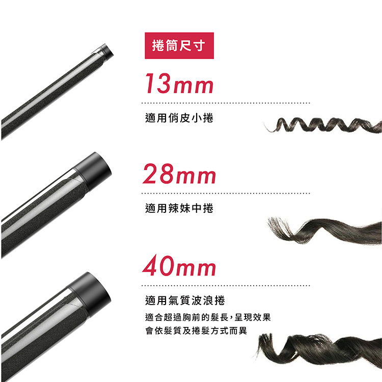 3種捲筒,13mm / 28mm / 40mm,適用於所有髮長和造型需求
