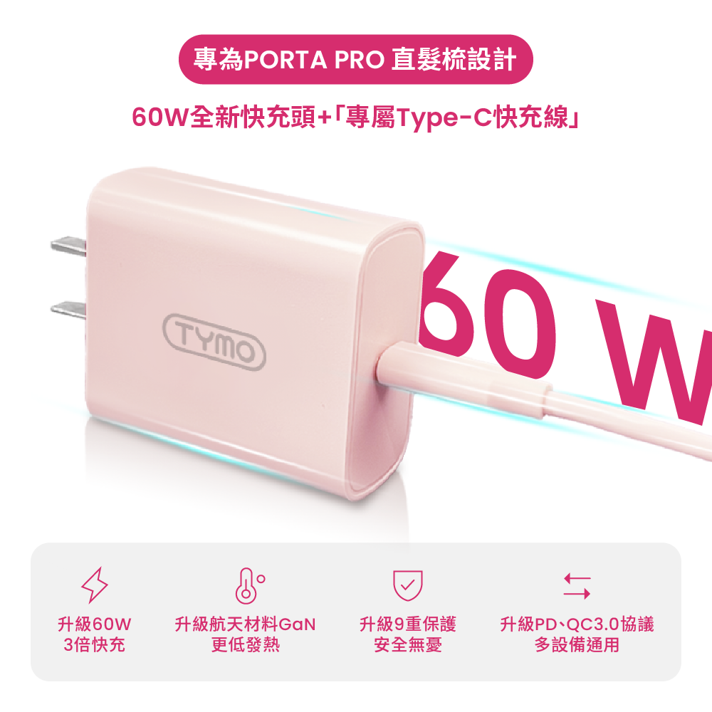 • PORTA PRO 全新升級即插即用模式,即通過搭配60W 快充頭可由無線模式切換為有線模式,請您使用TYMO原裝60W快充頭