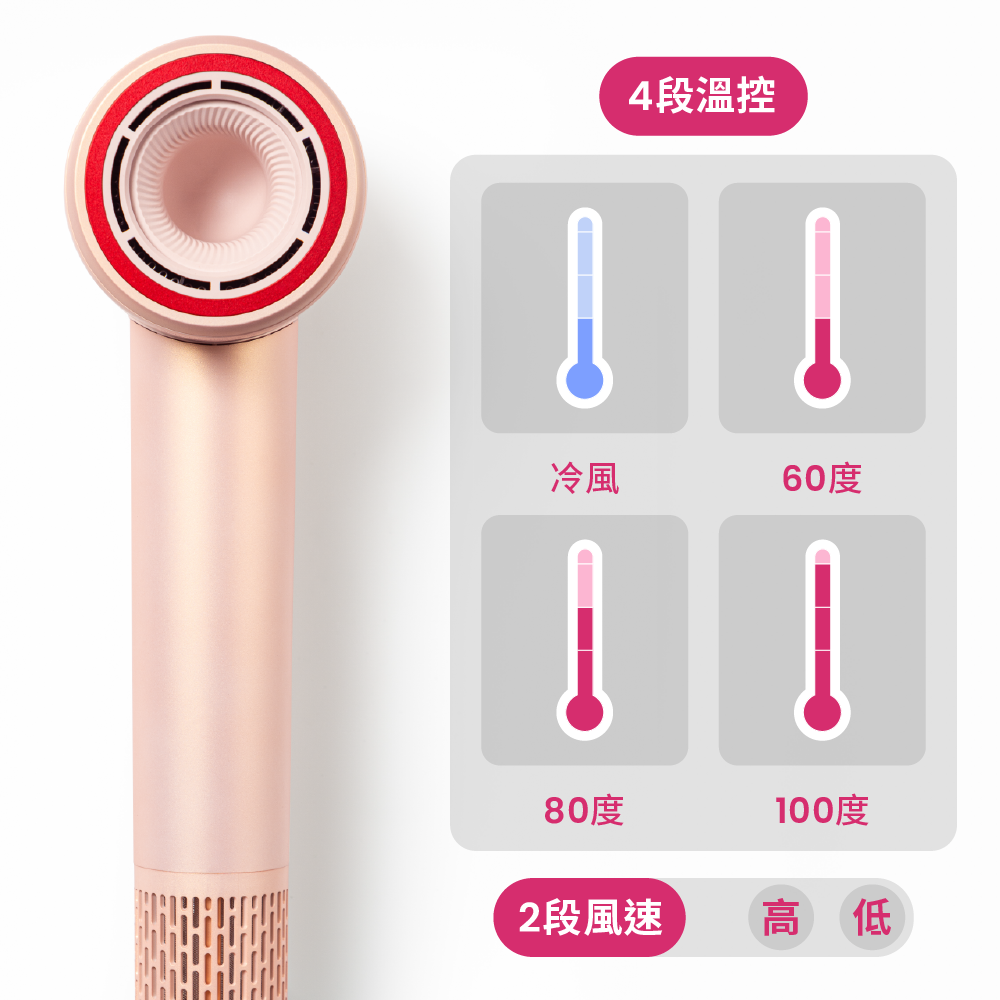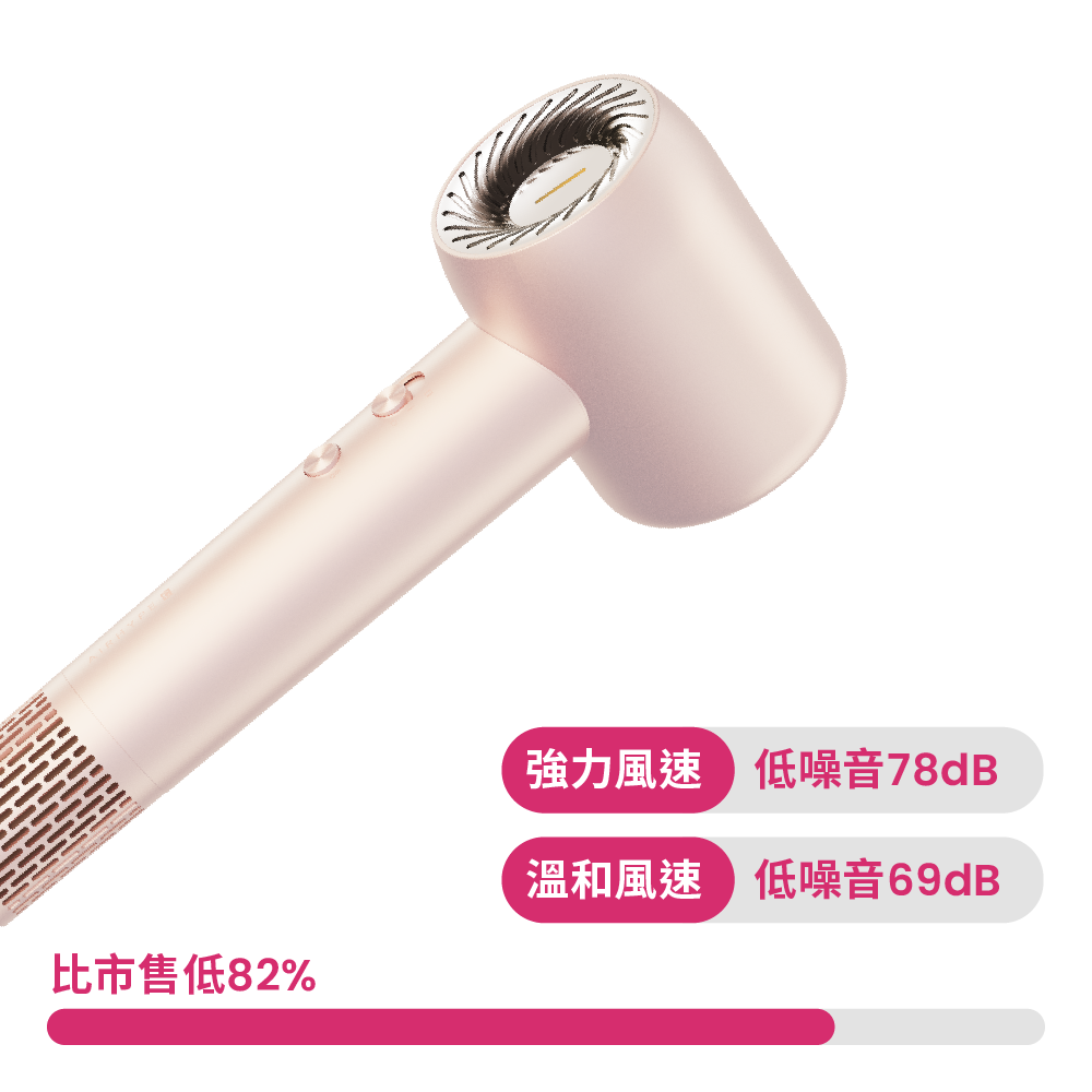 強力風速78分貝,溫和風速69分貝,相比市售吹風機噪音降低 82 %